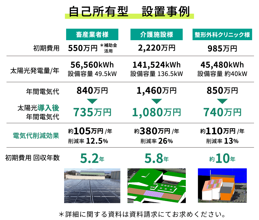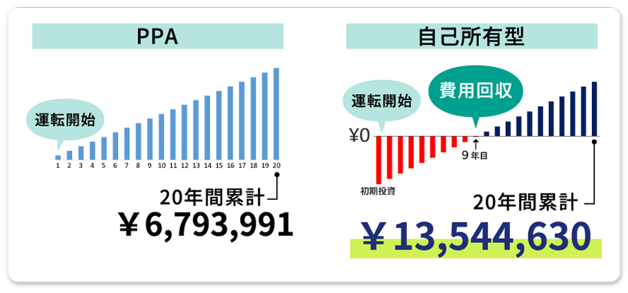 自己所有型は設備導入のためのコスト、定期点検等のランニングコストが発生しますが、1kWh当たりの発電コストは10円を下回ることが多く、電気代削減効果が高いことが特徴です。